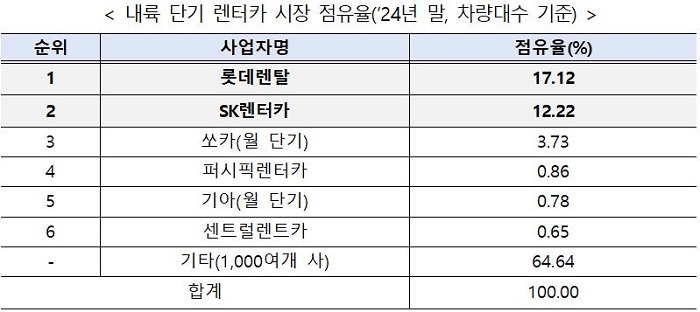 단기 렌터카 시장에서 롯데렌탈과 SK렌터카는 각각 1・2위 사업자 지위를 확고히 유지해 왔다. 양 사의 시장점유율 합계도 꾸준히 증가하는 추세로서, 2024년 말 기준 각각 내륙 29.3%, 제주 21.3%로 나타난다. 반면, 나머지 경쟁사들은 대부분 영세한 중소 사업자로서, 각각의 시장점유율은 미미한 수준이다.